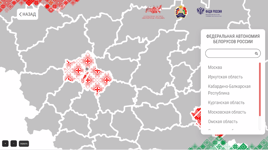 Полноэкранная карта России с выделенными регионами проживания белорусской диаспоры. При нажатии на регион открывается подробная информация: история, культурные центры, известные представители, фотогалерея.