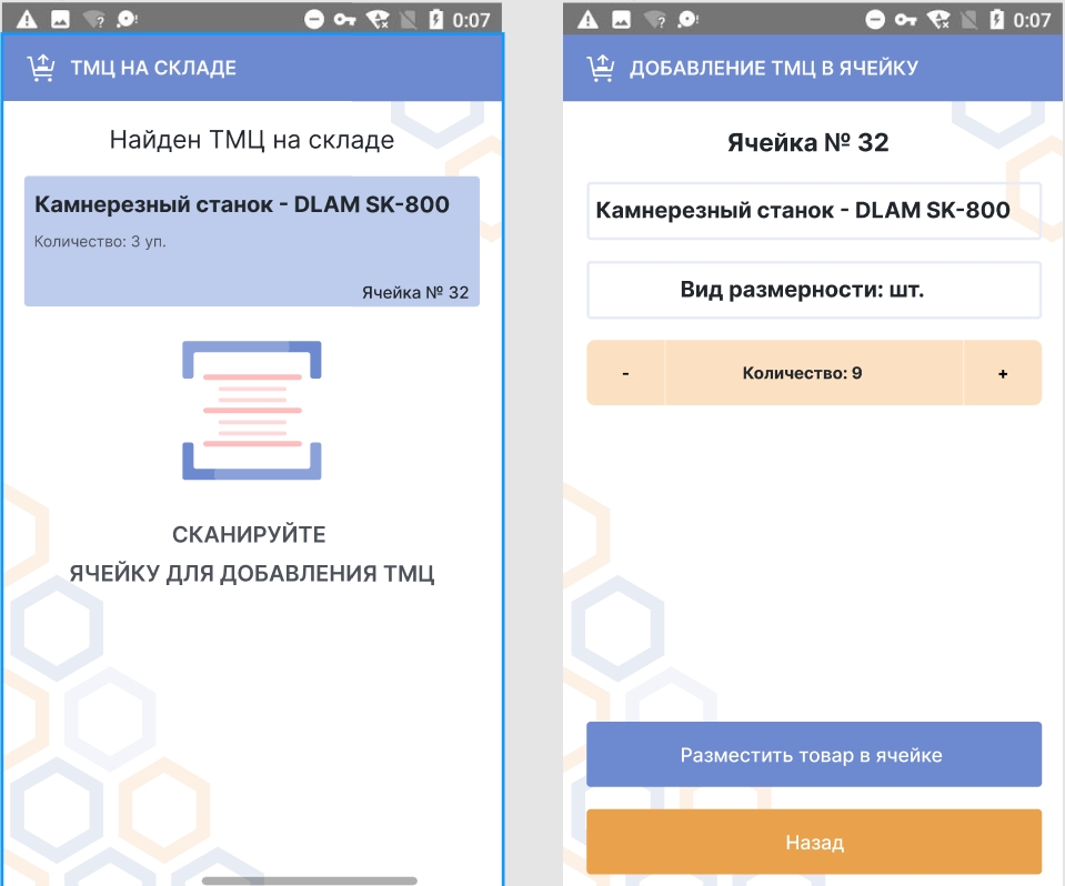 Встроенный сканер штрихкодов через камеру смартфона. Кладовщик сканирует товар, и система автоматически находит адрес хранения или предлагает ячейку для размещения.