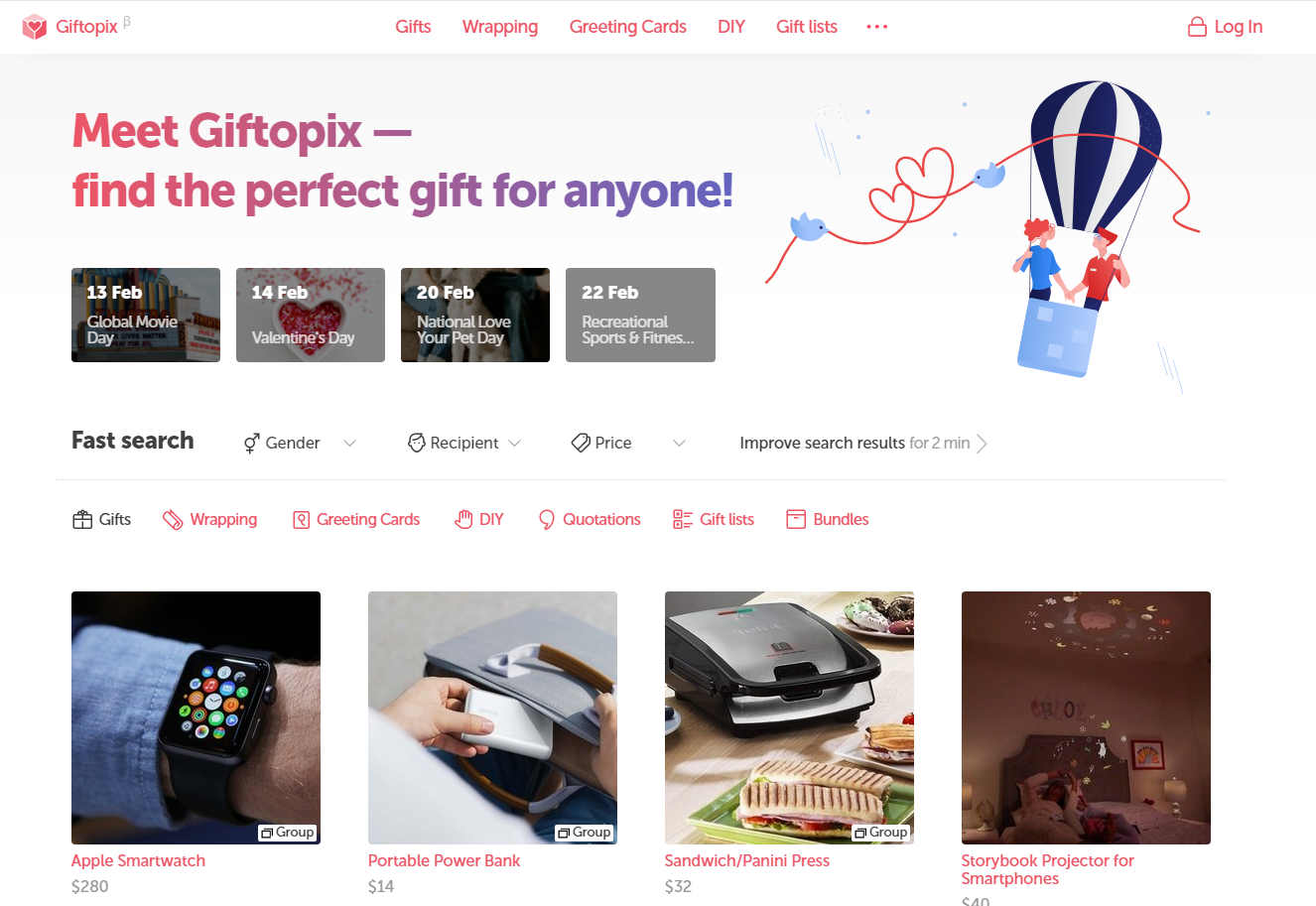 Универсальная платформа поиска подарков, упаковок и открыток. Удобный интерфейс с возможностью сохранять находки и делиться ими с друзьями.