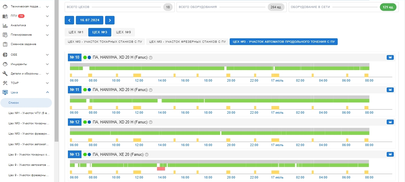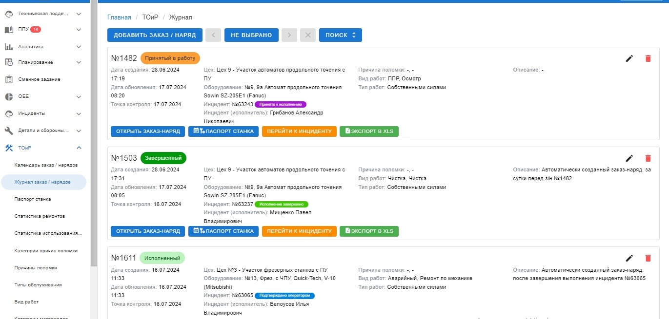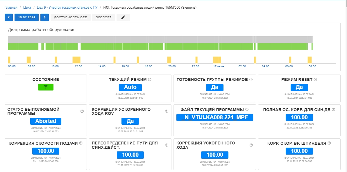 Модуль ENGINE подключается к датчикам и контроллерам промышленного оборудования, получая данные в реальном времени. Операторы видят на интерактивных дашбордах текущее состояние каждой единицы оборудования: температуру, давление, скорость вращения, вибрацию и другие параметры. При отклонении от нормы система автоматически формирует уведомление и отправляет его ответственным специалистам.