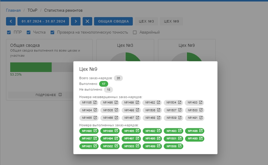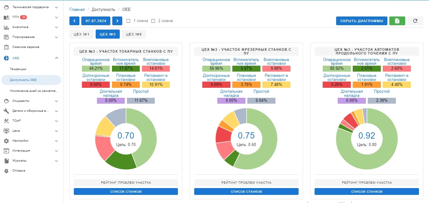 Система собирает и анализирует данные о простоях, потерях и предложениях по улучшению. Формируются отчёты по методологии Lean: карты потока создания ценности, диаграммы Парето, трекинг KPI по подразделениям. Руководство видит реальную картину эффективности производства в разрезе цехов, участков и смен.